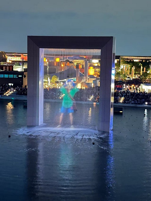 该设备是利用海市蜃楼的成像原理借助空气中存在的微粒将光影像呈现,使用一层很薄的水雾墙代替传统的投影幕,使您能在该屏幕影像中随意穿梭,达到真人可进入视频画面的虚幻效果。